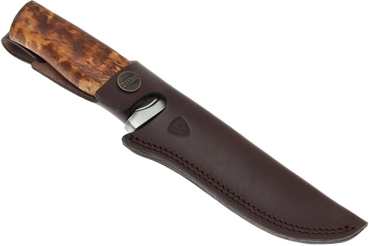 Le Helle GT 36 est l’un des plus grands couteaux de la gamme Helle. NĂ©anmoins, le poids dĂ» Ă la coque en aluminium et Ă l’absence de garde est relativement faible. Cette mitre en aluminium offre non seulement un soutien supplĂ©mentaire pendant l’utilisation, mais aussi une sĂ©curitĂ© supplĂ©mentaire pour vos doigts. Le manche est fait de bois de bouleau ondulĂ©. FormĂ© Ă la main, poli et huilĂ© pour donner au manche son caractère unique. La lame est en full-tang, ce qui signifie que l’acier continue jusqu’Ă l’extrĂ©mitĂ© du manche. En ce qui concerne l’acier, le choix s’est portĂ© sur l’acier carbone laminĂ© 3 couches.
