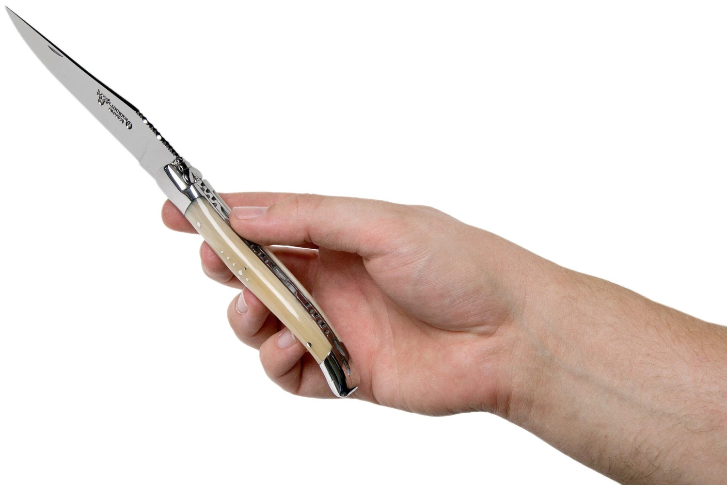 Ce couteau de poche Laguiole en Aubrac 12cm classic est un couteau Laguiole classique. Le dos du manche est richement décoré avec un magnifique guillochage. La lame est en acier Sandvik 12C27 résistant à la corrosion. Les mitres et la lame ont une finition polie. Le tout pour un aspect très chic. Le manche présente la croix du berger typique des couteaux Laguiole.